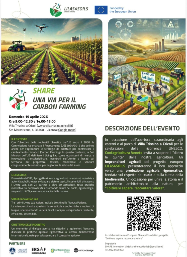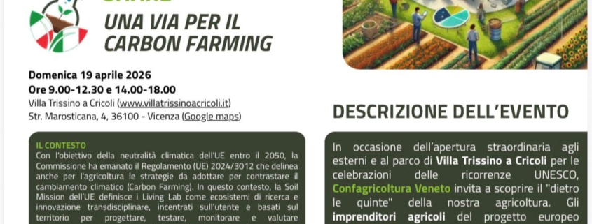 “Domenica saranno presenti parecchi giovani di Confagricoltura Veneto – spiega la presidente Anna Trettenero -, tra cui i vicentini Matteo Marcolin, Elia Negretto e Marcello Messi, che partecipano al progetto europeo Lilas4soils. Agricoltori, ricercatori, industrie e autorità pubbliche sviluppano sistemi agricoli sostenibili attraverso i Living Lab, laboratori che progettano e testano nuove tecnologie. A Villa Trissino gli imprenditori agricoli presenteranno “Share innovation lab”, un laboratorio che coinvolge aziende che spaziano dai settori cerealicoli e zootecnici a impianti di biogas, sperimentando varietà di soluzioni per un’agricoltura resiliente, efficiente, sostenibile. Si parlerà, in sintesi, di salute del suolo, agroecologia, sequestro di CO₂ e uso responsabile delle risorse”.