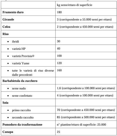 Ricordiamo che per la richiesta degli aiuti accoppiati per determinate coltivazioni ammesse si deve utilizzare semente certificata, rispettando le quantità minime previste (vedi tabella che segue).